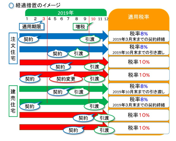 このとき、上記図のように、住宅請負契約と消費税の増税には「経過措置」といった関係があります。消費税の経過措置とは、「住宅購入の契約」と「住宅の引き渡し時期」によって消費税が8%のままか10%になるのかといったルールのことをいいます。要するに、経過措置の要件を満たすことで、